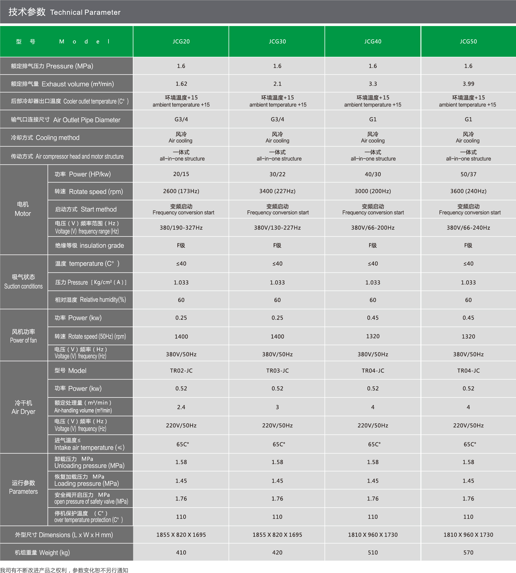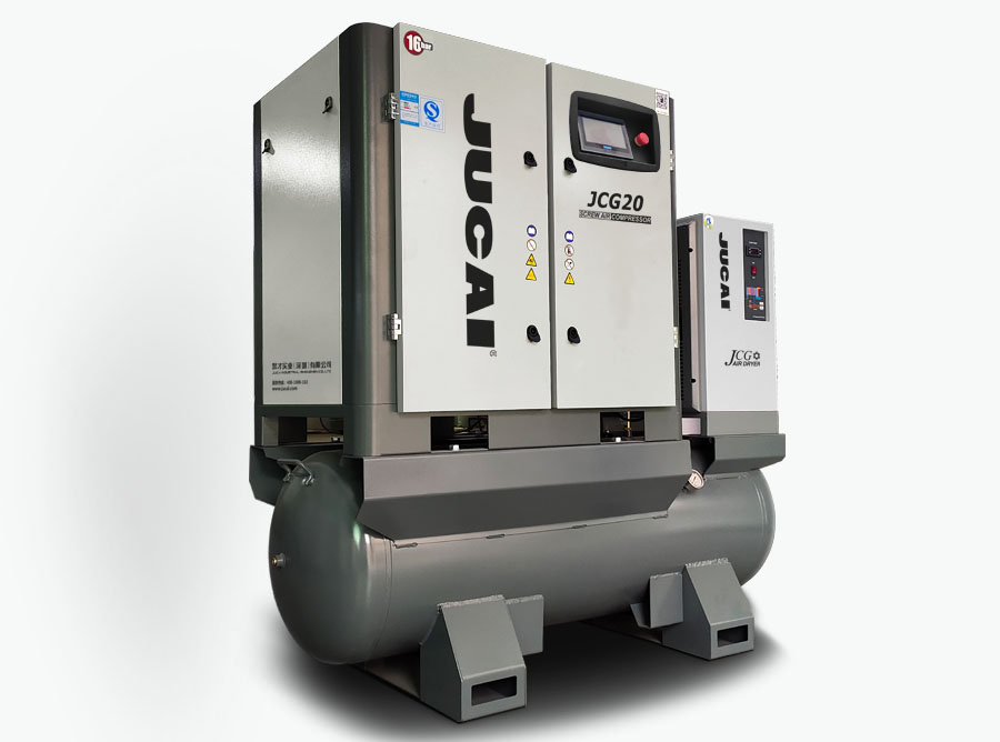 Screw air compressor, refrigerated dryer, filter and air storage tank in one,