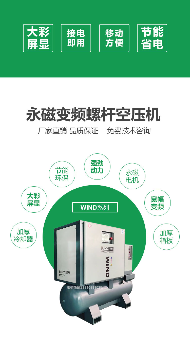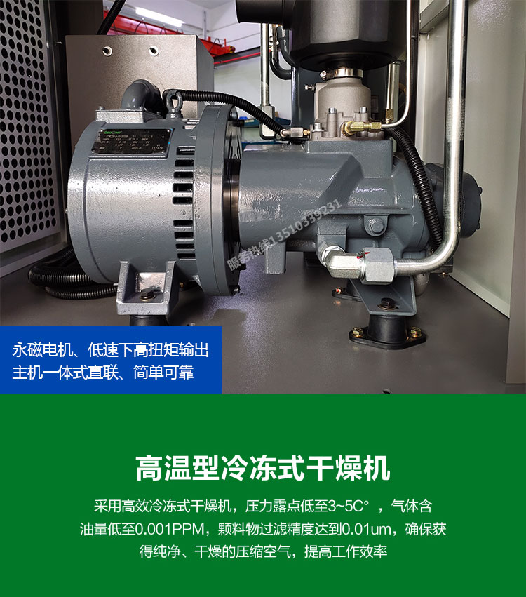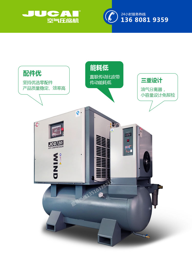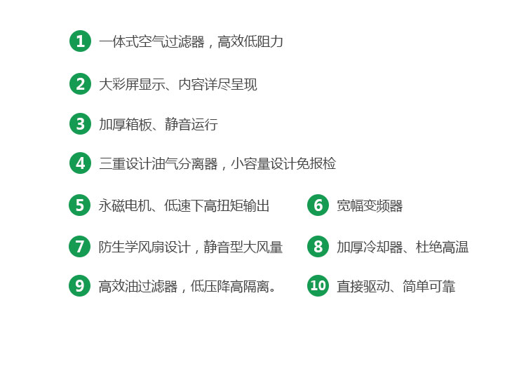 空壓機整機能效高于國家一級能效標準,每產一立方的氣比行業大部分機器用電量少,氣量足,比行業基準多10%,適應惡劣工況條件,按24小時滿載運行設計制造,將機械和電器完美融合。