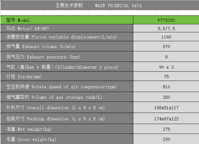 標題:FT75250 新型節(jié)能環(huán)保活塞空壓機 5.5kW/7.5HP